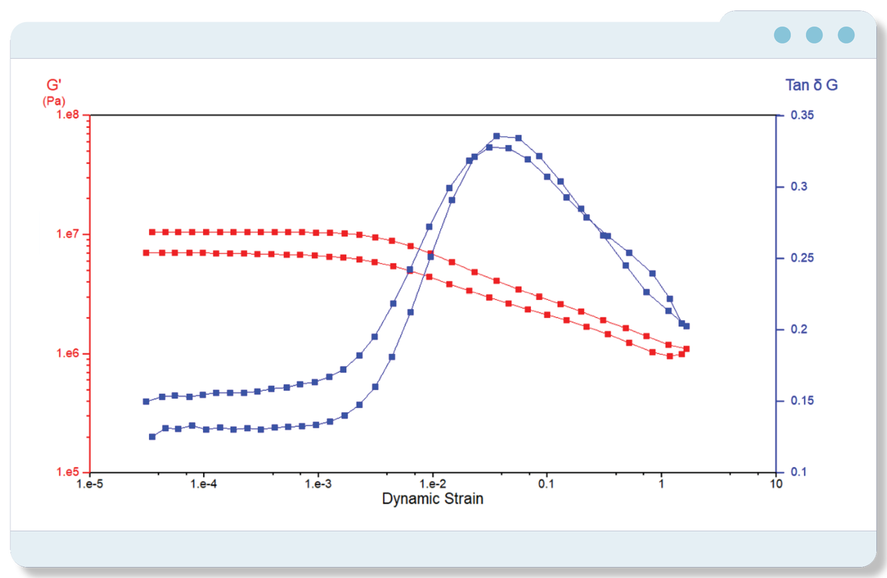 From a certain strain applied on the polymer, the viscoelastic properties start to change : the modulus of elasticity decreases and a Tan Delta peak is observed as it can be observed in the figure. This level of deformation for which the properties vary is called nonlinear domain. Because the mechanical properties of a material usually need to be preserved during its application time, knowing the limit between the linear and the non linear domain is a key point in the material conception. Isothermal DMA strain sweep is a quick and reliable method to determine the linear domain.