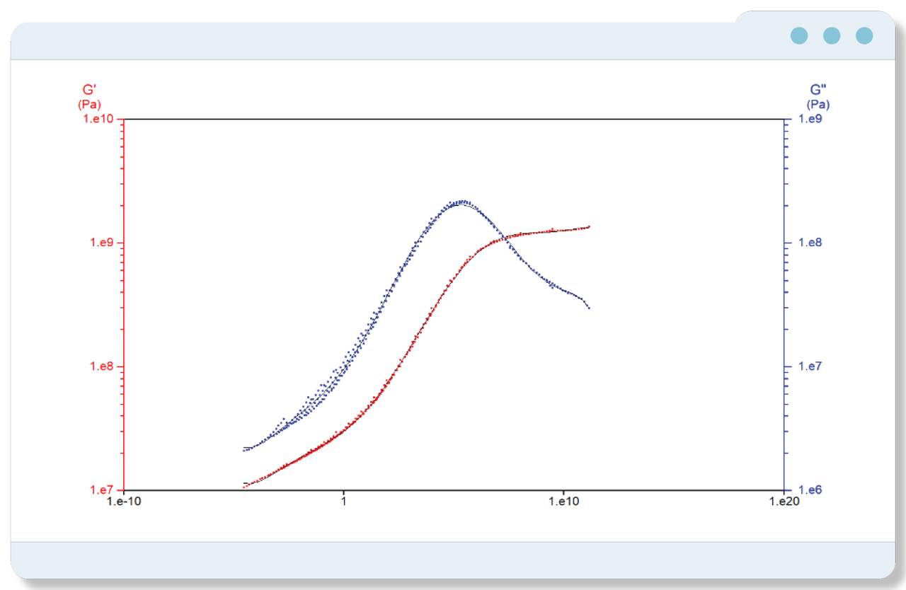 L’exemple ci-dessus présente les courbes maîtresses d’un caoutchouc, obtenues avec une combinaison des modèles WLF et Arrhenius. Une sélection pertinente des paramètres permet d’assurer une répétabilité parfaite du calcul des courbes maîtresses en évitant tout effet d’opérateur.