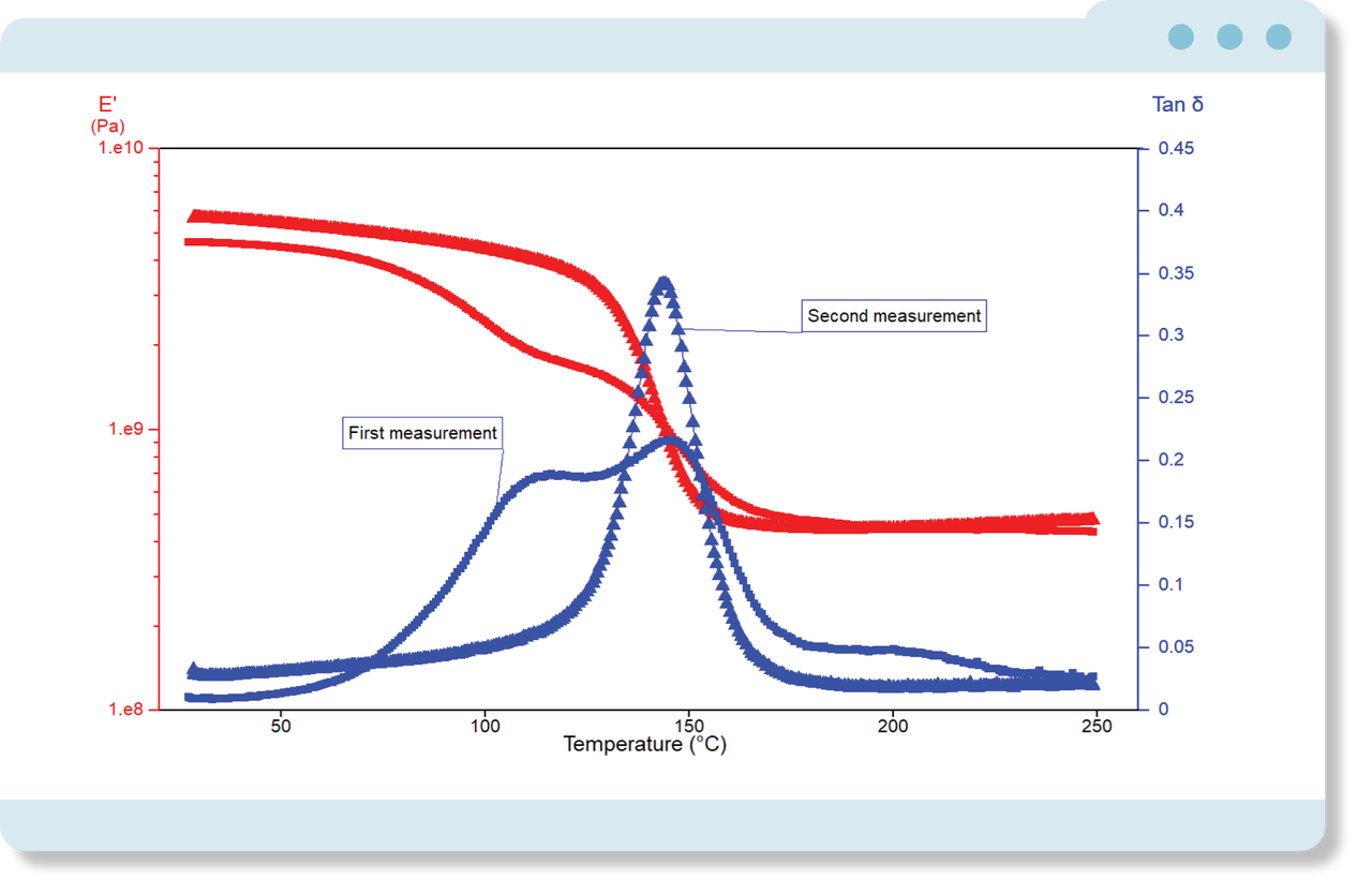 Dans l’exemple ci-contre, dans l’essai n° 1, un échantillon d’un matériau à base d’époxy est testé sur une rampe de température allant jusqu’à 250°C ; il présente une zone de transition vitreuse étalée avec deux pics de Tan Delta.