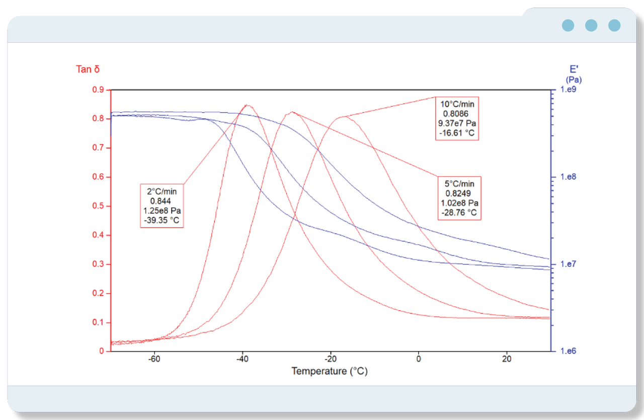 La figure ci-dessus montre la précision du DMA de Metravib pour caractériser le module de conservation des élastomères (E’) et le facteur de perte (Tan δ) avec différents taux de température (2°C/min, 5°C/min et 10°C/min). Cela démontre que la transition vitreuse varie beaucoup avec le taux de température. Parmi tous les taux de température, le taux de température suggéré par Metravib pour les balayages de température est de 2°C/min selon les normes ASTM et ISO.