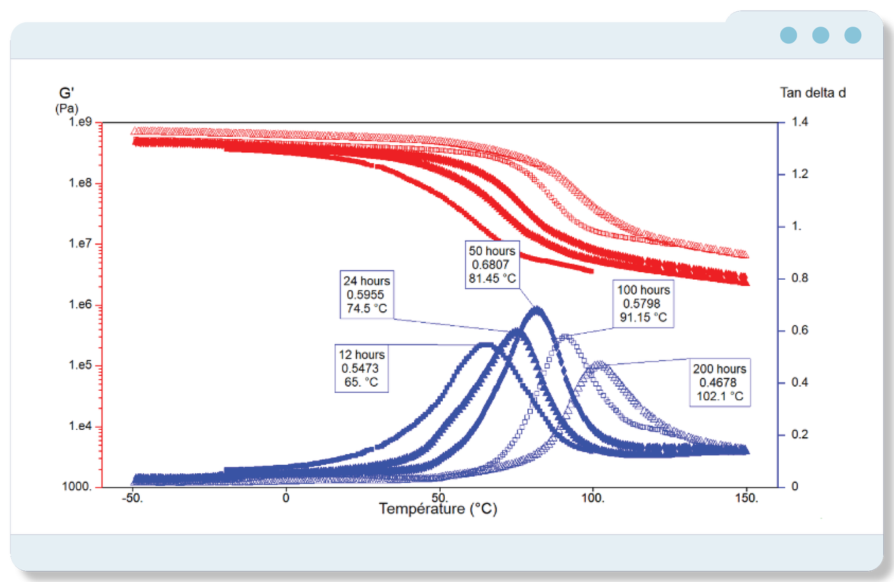 La mesure DMA des propriétés viscoélastiques est un outil clé pour mesurer l’effet du vieillissement. A titre d’exemple, la figure montre un balayage de température effectué de -50°C à 150°C sur cinq éprouvettes de PVC différentes âgées de 12, 24, 50, 100 et 200 heures. Il a été observé que le module G et le pic Tan Delta augmentent avec l’augmentation du vieillissement du PVC.