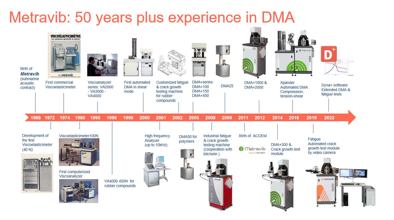 - 2022: Metravib equips its DMA+ series with a new software: Dyna+. Bringing together all dynamic tests: DMA, fatigue, and crack growth testing, Dyna+ allows unlimited test combinations, the vast majority of which can be carried out with the Xpander robot.